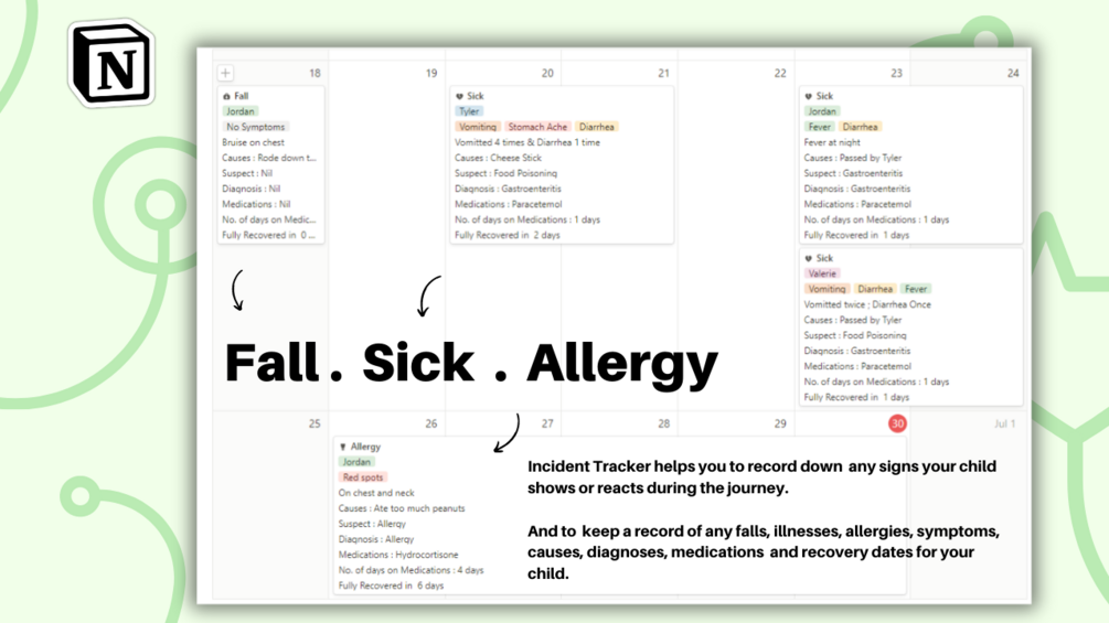 - Stay prepared: By documenting incidents like falls, sickness, or allergies, you are better prepared to handle future situations. You can identify patterns, understand causes, and take preventive measures to keep your child safe and healthy.